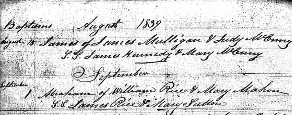 - Abraham Rice – Baptised in September 1839. Godparents: James Rice and Mary Sutton.