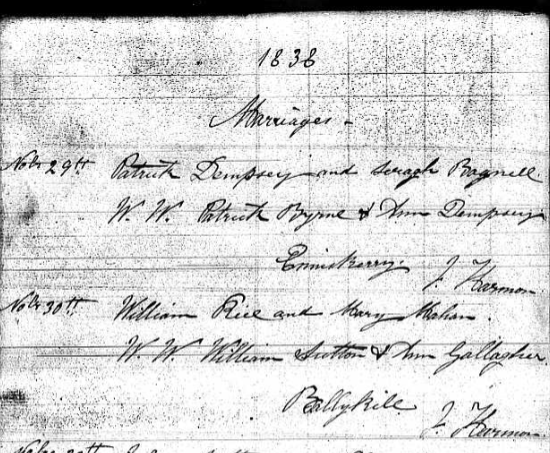 William Rice, born circa 1816, married Mary Mahon in November 1838 at Enniskerry, County Wicklow. Their recorded residence at the time of marriage was Ballycoyle (also known as Ballykile), a rural townland in the Upper Glencree Valley. The marriage was witnessed by William Sutton and Ann Gallagher, confirming the event as a documented and verifiable point of origin for the Rice family in this region.